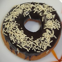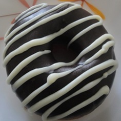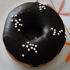 This dark chocolate coated ring with white sprinkles is always tempting for everyone. Black and white treat goes well with any beverage.