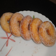 These soft and moist rings are glazed with a coating of cinnamon and sugar mixture. Good energy-filling mild sweet substitute for all day long.